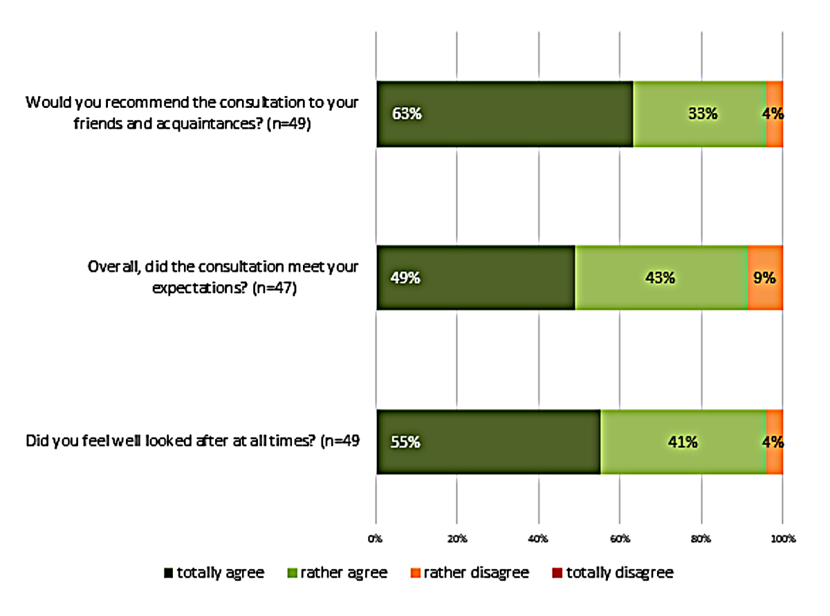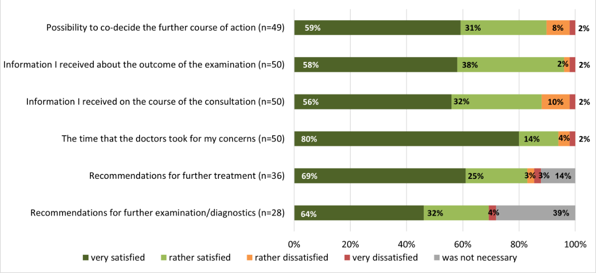Regarding specific aspects of the clinic, the majority of patients indicated high satisfaction with their ability to co-decide the further course of action, with 59.2% (29/49) being very satisfied and 30.6% (15/49) rather satisfied. Similarly, 58.0% (29/50) were very satisfied and 38.0% (19/50) were rather satisfied with the information they received about the examination outcomes (figure 3).