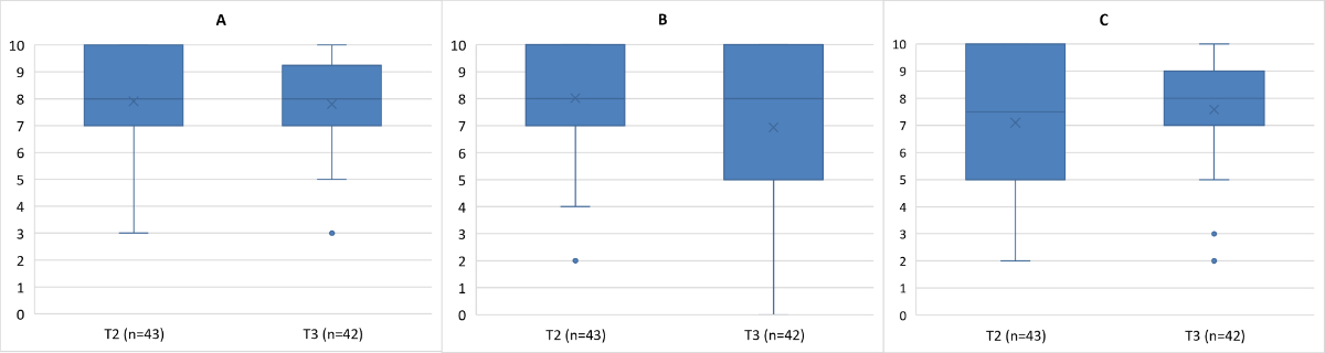 Figure 4Retrospective satisfaction with the multidisciplinary post-COVID outpatient clinic on a scale from 0 (totally dissatisfied) to 10 (totally satisfied) regarding: (A) general; (B) initiated treatments; and (C) diagnostic procedures. The line dividing the box in two represents the median value, X represent means. Boxes represent interquartile ranges, the whiskers encompass each 25% of the lower and upper values of the distribution, dots mark outliers.