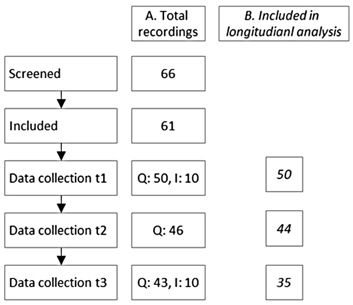Qualitative data were collected at time points t1 and t3 through semi-structured interviews focusing on: