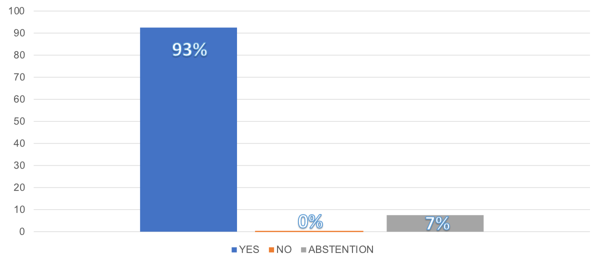 Figure 1Results of the Swiss Society of Urology voting on 20th September 2023 concerning the potential future of prostate cancer screening in Switzerland: “Considering the evidence and the significant amount of ongoing opportunistic screening, Switzerland should take a stepwise approach, including piloting and further supporting research to evaluate the feasibility of implementation of organised programs aimed at assuring appropriate management and quality of prostate cancer screening”.