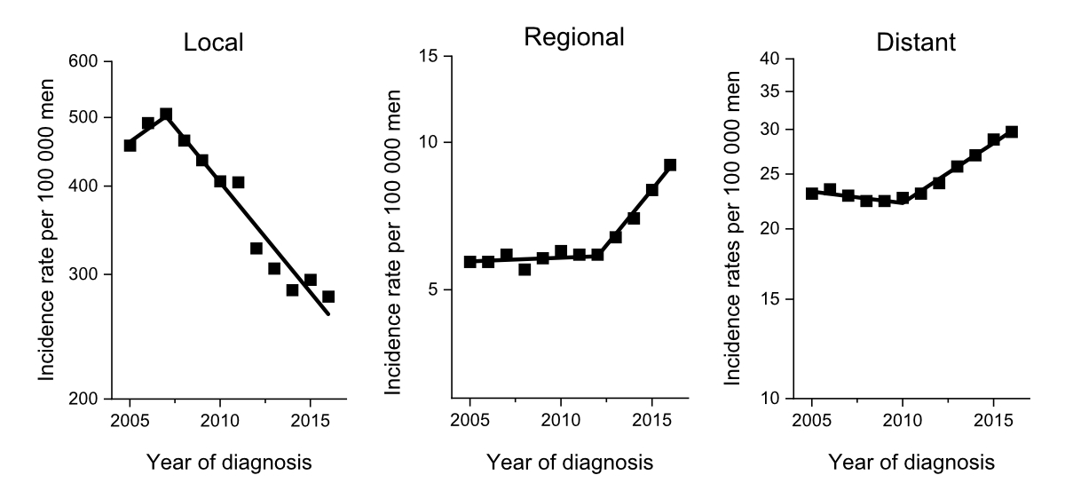 Figure 2Incidence rates of prostate cancer between 2005 and 2015 in the United States, stratified by localised disease, regional lymph node metastasis, and distant metastasis, demonstrating the effects of the United States Preventive Service Task Force recommendations against PSA testing of men above 75 years of age in 2008 and in all men in 2012. From: Jemal A, Culp MB, Ma J, Islami F, Fedewa SA. Prostate Cancer Incidence 5 Years After US Preventive Services Task Force Recommendations Against Screening. J Natl Cancer Inst. 2021 Jan 4;113(1):64-71. doi: 10.1093/jnci/djaa068, by permission of Oxford University Press.