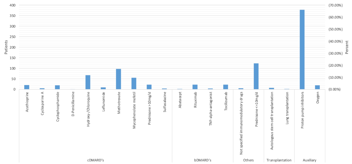 All treatments with potentially disease modifying agents per patient are depicted in figure 2. Regarding non-biologic DMARDs, the most frequently prescribed medication was methotrexate, in 97 (16.4%) patients, followed by hydroxy-/chloroquine, in 67 (11.4%), and mycophenolate mofetil in 55 (9.3%) patients. Among biologic DMARDs, rituximab and tocilizumab were administered most frequently, each in 23 (3.9%) patients. Additionally, 124 (21%) patients were treated with low-dose prednisone (≤10 mg/d). Seven (1.2%) underwent haematopoietic stem cell transplantation and two (0.3%) lung transplantation. Furthermore, 378 (64.1%) received proton-pump inhibitors and 20 (3.4%) required oxygen supplementation.