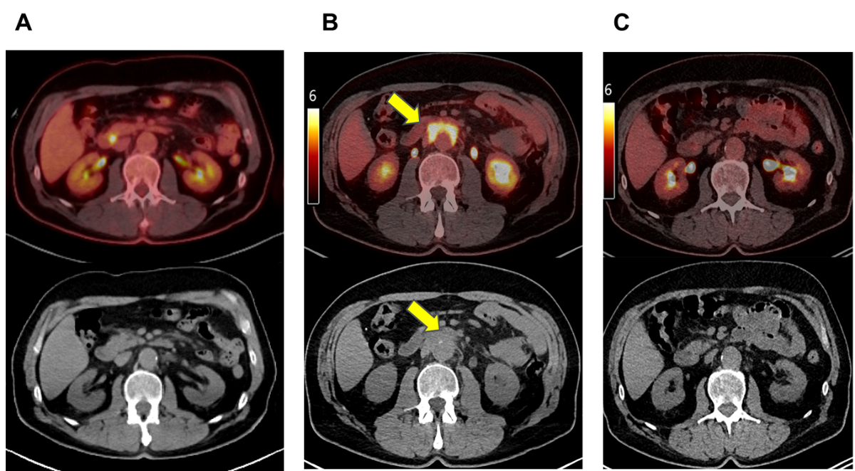 Figure 12-[18F]FDG PET/CT imaging findings. (A) A co-registered PET/CT and non-contrast-enhanced CT show the aorta without periaortic soft tissue abnormality before immune checkpoint inhibitor (ICI) therapy. (B) A co-registered PET/CT and non-contrast-enhanced CT show an intensively FDG-enhanced (max SUV = 8.3) periaortic soft tissue mass (10 × 5 cm) after ICI therapy. (C) Post-glucocorticoid treatment PET/CT and non-contrast-enhancedCTshowtotal regression of the periaortic soft tissue mass and FDG avidity.