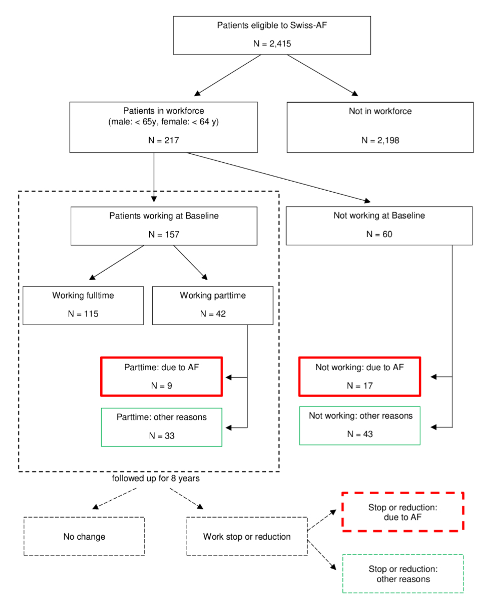 Atrial fibrillation (AF) is the most common serious arrhythmia worldwide and is associated with a broad range of symptoms and complications, including major complications such as stroke, heart failure and dementia [1]. Depending on disease severity, atrial fibrillation-related symptoms or complications can substantially affect a patient’s daily life activities [2]. With regard to younger atrial fibrillation patients under the age of retirement, an important open question is whether and how atrial fibrillation symptoms and complications affect professional activity and employment, and cause indirect costs to society due to lost productivity.