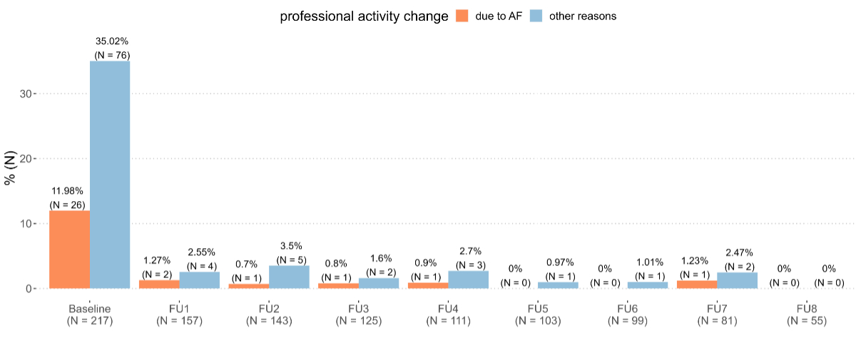 Our findings seem to be mainly consistent with the available, scarce literature. In our study, 3.8% of the working patients reported a professional activity change due to atrial fibrillation and 11.6% due to other reasons over the 8-year follow-up period. A study from the UK reported 6% health-related job losses over a 2-year follow-up period and 19% work stops due to other reasons [5]. The numbers are similar, but not directly comparable, since work losses included any health problems and the observation period was much shorter than in our study.