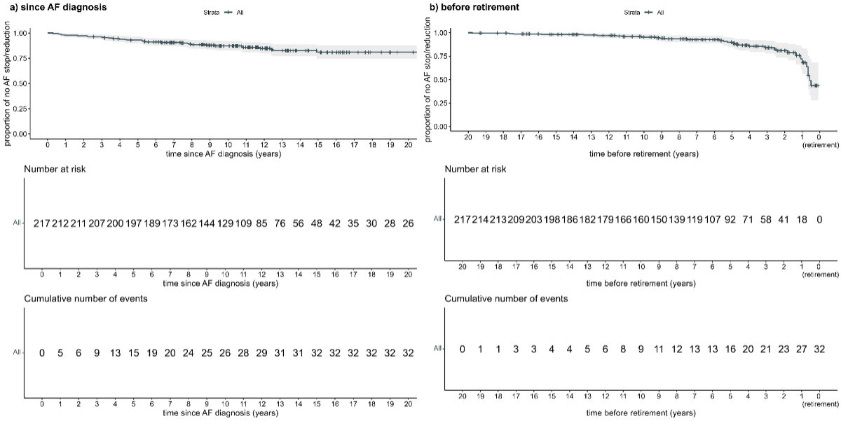 Figure S1Time to first atrial fibrillation (AF)-related professional activity change: (A) time since atrial fibrillation diagnosis and (B) time before retirement. In (A) there is a slight decrease over time, meaning that patients were more likely to report an impact of atrial fibrillation on their professional activity the longer they had had atrial fibrillation. When looking at years until retirement, a steeper decrease is seen within 6 years before retirement. Patients were thus more likely to report a professional activity change due to atrial fibrillation in the years close to their retirement.