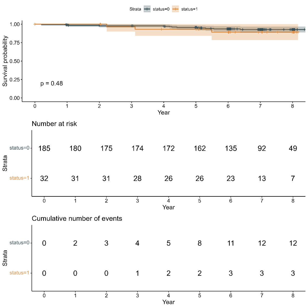 Comparing the survival probability for patients with and without atrial fibrillation-related professional activity change, no difference was observed over the full time period (appendix figure S2).