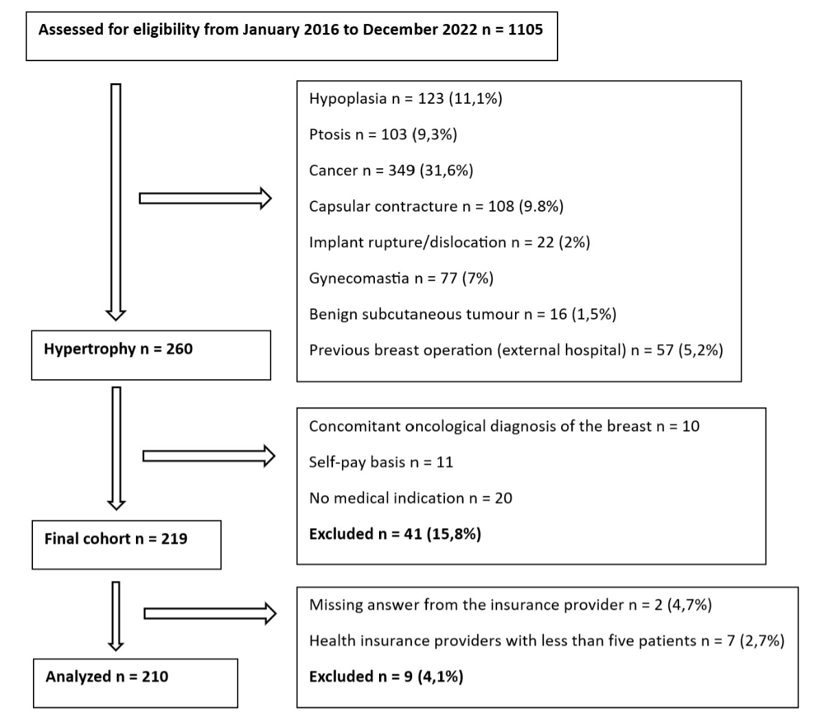 For this study, we focused on patients with symptomatic breast hypertrophy, who were potentially eligible for insurance coverage based on the guidelines established by the Swiss Society of Insurance Physicians (BGE 130 V 299) [27]. Given the retrospective design of the study, only patients meeting the following criteria were included: