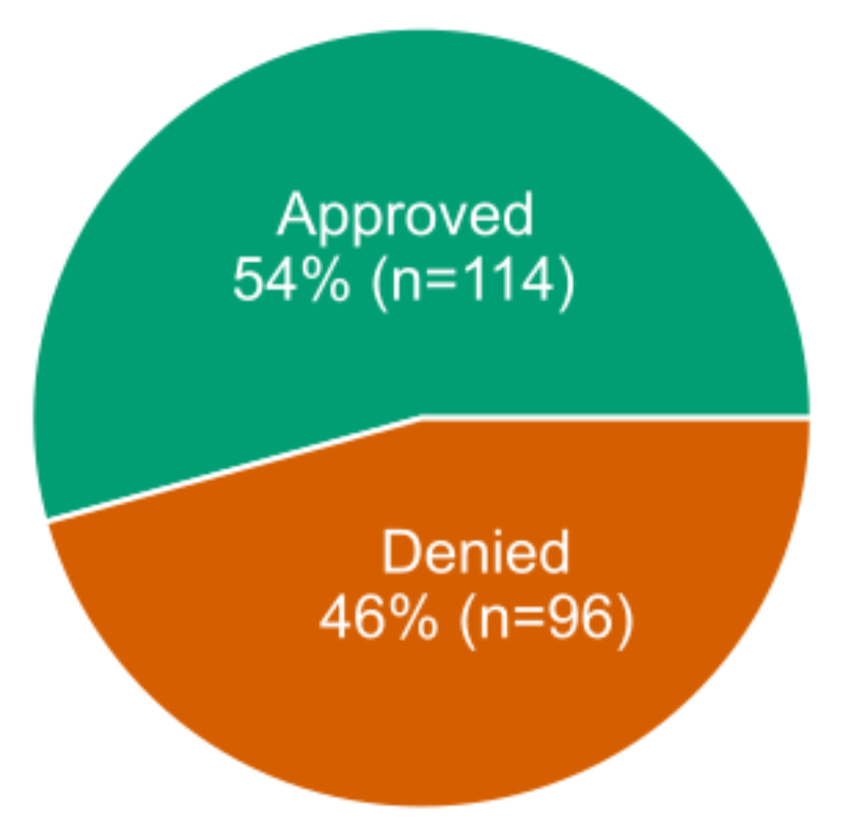 Among the remaining 210 patients, 150 underwent breast reduction surgery. Regarding the 210 cost approval requests, 114 were approved (54%) and 96 were denied (46%).
