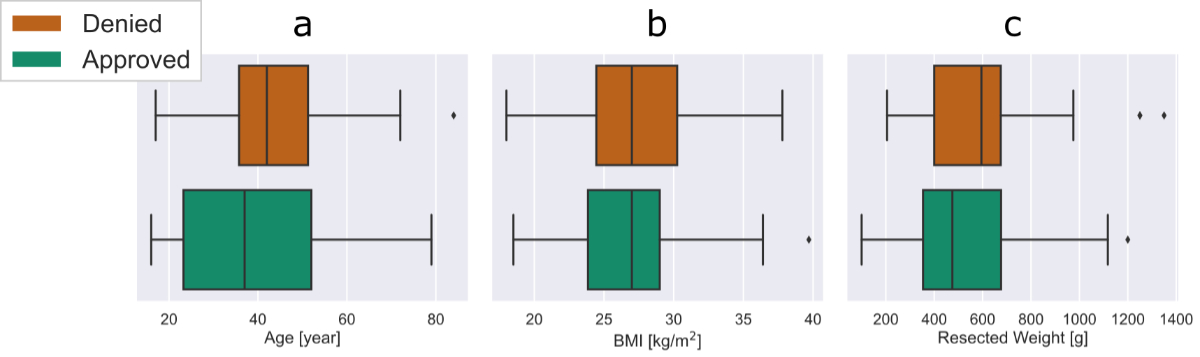 Among variables (figure 4), the median age, BMI, and resected weight did not differ significantly between health insurance providers (p = 0.20, 0.98, and 0.49, respectively). Additionally, all t-tests comparing cost approval and denial were nonsignificant (p = 0.11, 0.10, and 0.14, respectively). Therefore, mean age and resected weight did not differ significantly between cost denial (42.67 years and 585 g) and approval (39.25 years and 520 g). However, the post-hoc power of all t-tests was low (0.36, 0.39 and 0.31, respectively).