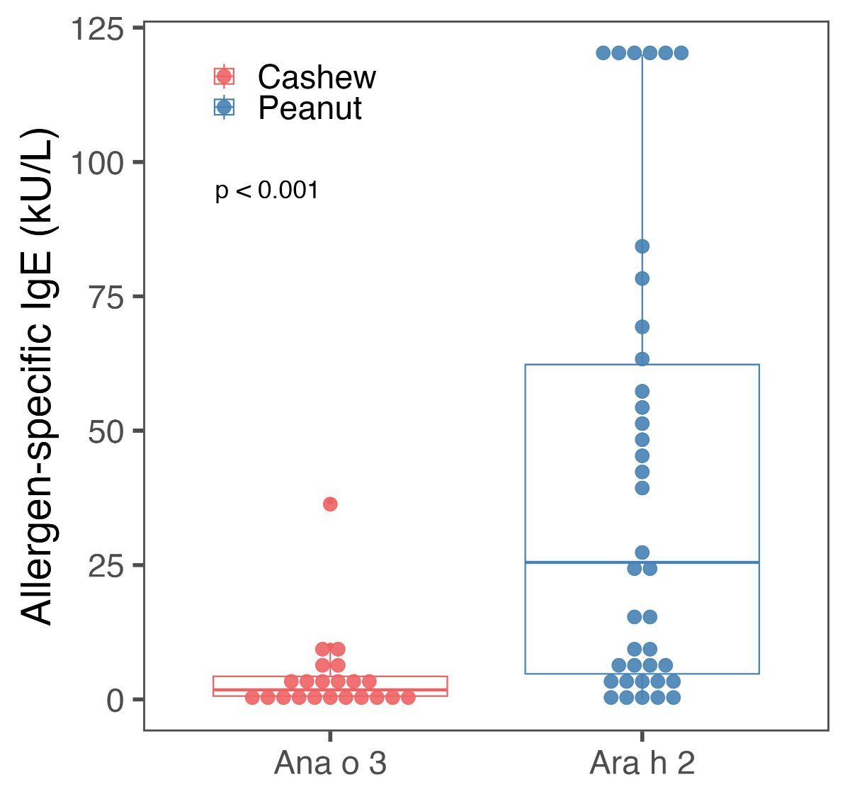 Figure 2Levels of baseline specific immunoglobulin E (sIgE) concentrations for nut-specific storage proteins Ana o3 / Ara h2 for cashew nut and peanut-allergic patients undergoing oral immunotherapy. Values >100 kU/l were set to 120 kU/l.