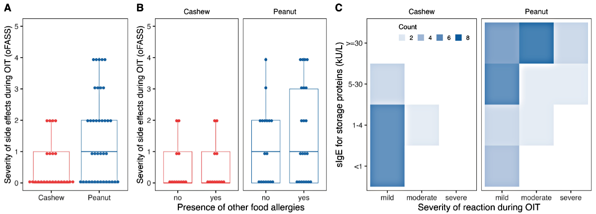 Figure 3(A) Maximum severity of allergic reactions during oral immunotherapy (OIT) by nut allergy graded by oFASS-5. (B) Maximum severity of adverse reactions during oral immunotherapy by nut allergy and separated by presence of other food allergies. (C) Heatmap of the maximum severity of reaction during oral immunotherapy (mild: oFASS 0–1; moderate: oFASS 2–3; severe: oFASS 4–5) in relation to the initial levels of specific immunoglobulin E (sIgE) against storage proteins (Ana o3, Ara h2). oFASS-5:ordinal food allergy severity scale 5.