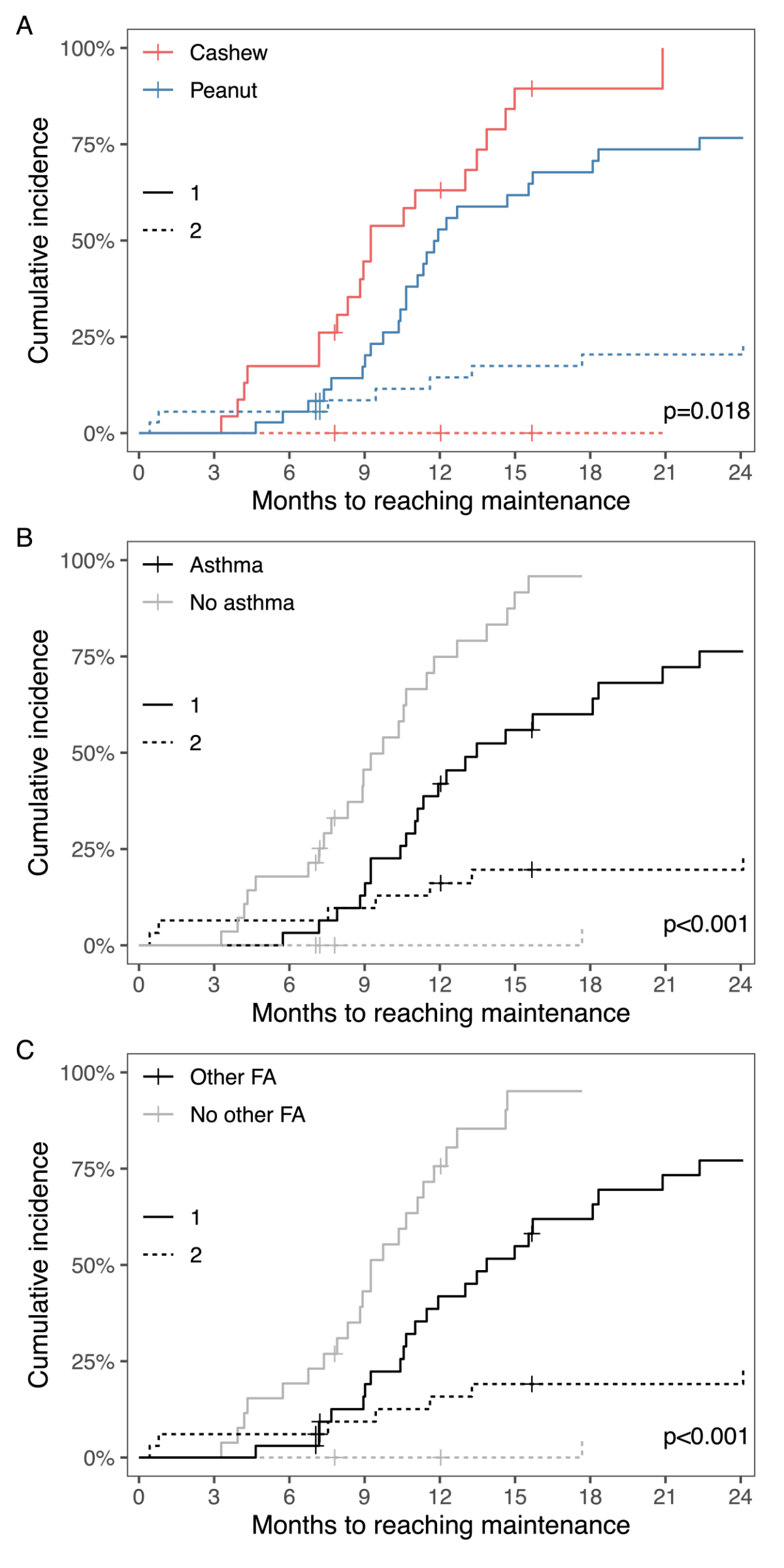 Figure 4Cumulative incidence curves for reaching maintenance dose in patients (A) undergoing therapy in the cashew nut (n = 24) and the peanut (n = 38) group, (B) with (n = 31) and without asthma (n = 31), and (C) with (n = 33) and without (n = 29) other food allergy (FA), (1) representing the patients who reached the maintenance dose (continuous lines), and (2) the group of patients who discontinued or changed the protocol due to adverse reactions or aversion to taste (dashed lines). Crosses representing patients who were lost to follow-up.