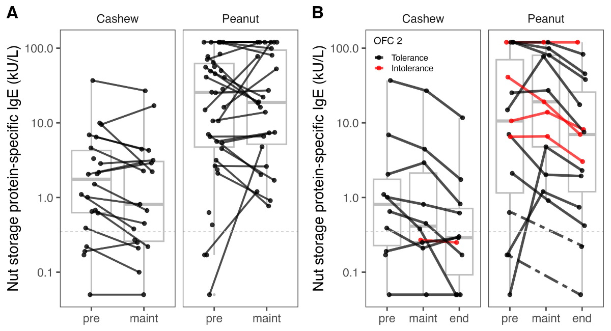 Figure 5(A) Changes in specific immunoglobulin E (sIgE) to the storage protein (Ana o3/Ara h2) from before starting the oral immunotherapy (OIT) to reaching maintenance dose. Complete data from two cashew nut and two peanut allergy patients are missing. (B) Progression over time of sIgE to the storage protein (Ana o3/Ara h2) for the patients who underwent a second oral food challenge (OFC) for cashew nut (n = 12) and peanut (n = 15). Black lines represent patients who had no reaction during the second oral food challenge and were classified as desensitised; red lines represent patients who failed to complete the second oral food challenge with an intolerance. Complete data from two cashew nut allergy patients and two peanut allergy patients are missing. Pre: before starting the oral immunotherapy; maint: start of the maintenance phase; end: end of the maintenance phase.