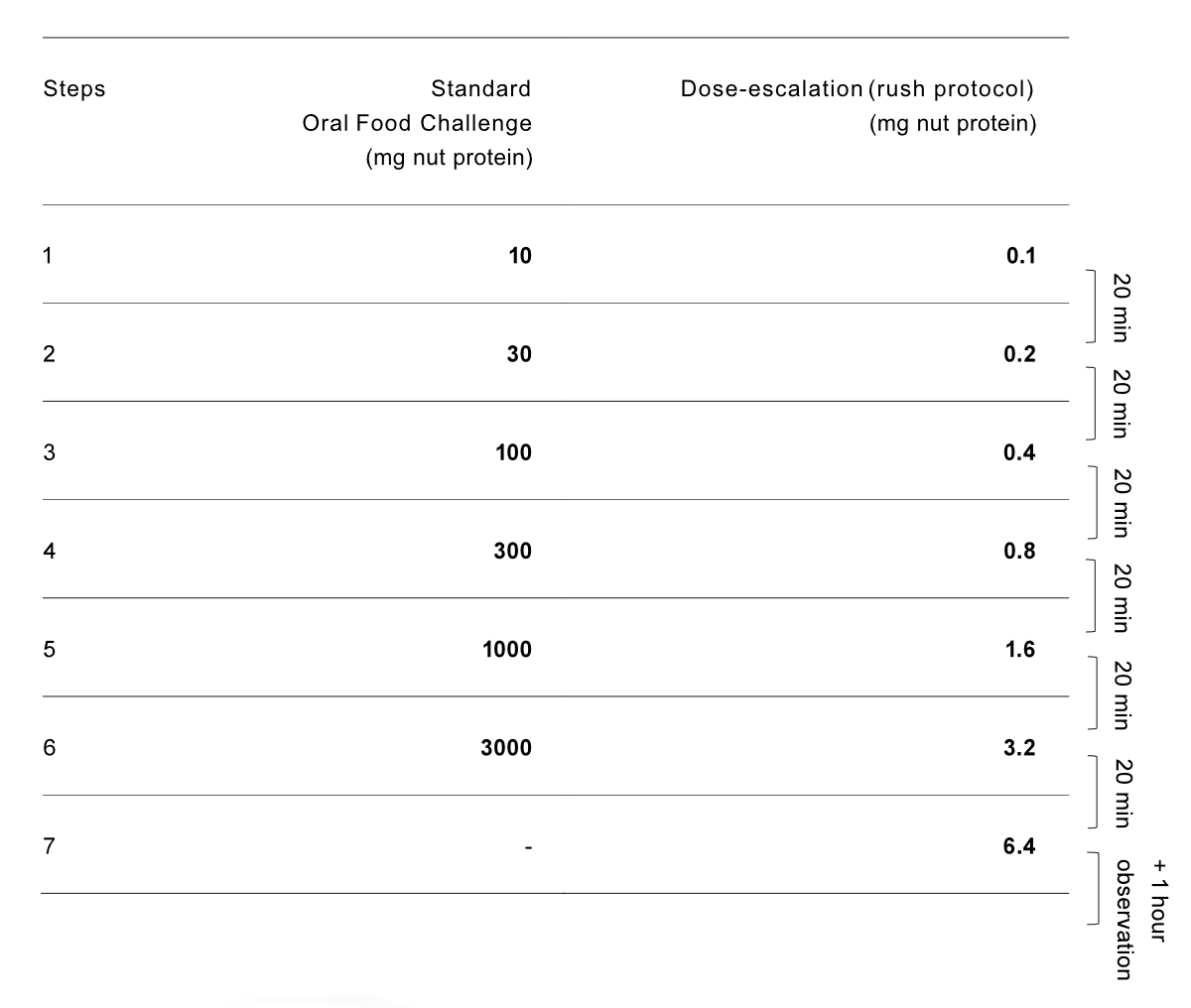 Patients who did not experience an allergic reaction during the second OFC, and were thus considered desensitised, were then allowed to consume the nut freely, with a minimum intake of 1 g nut protein twice per week. To date, no allergic reactions have been reported following the second OFC.