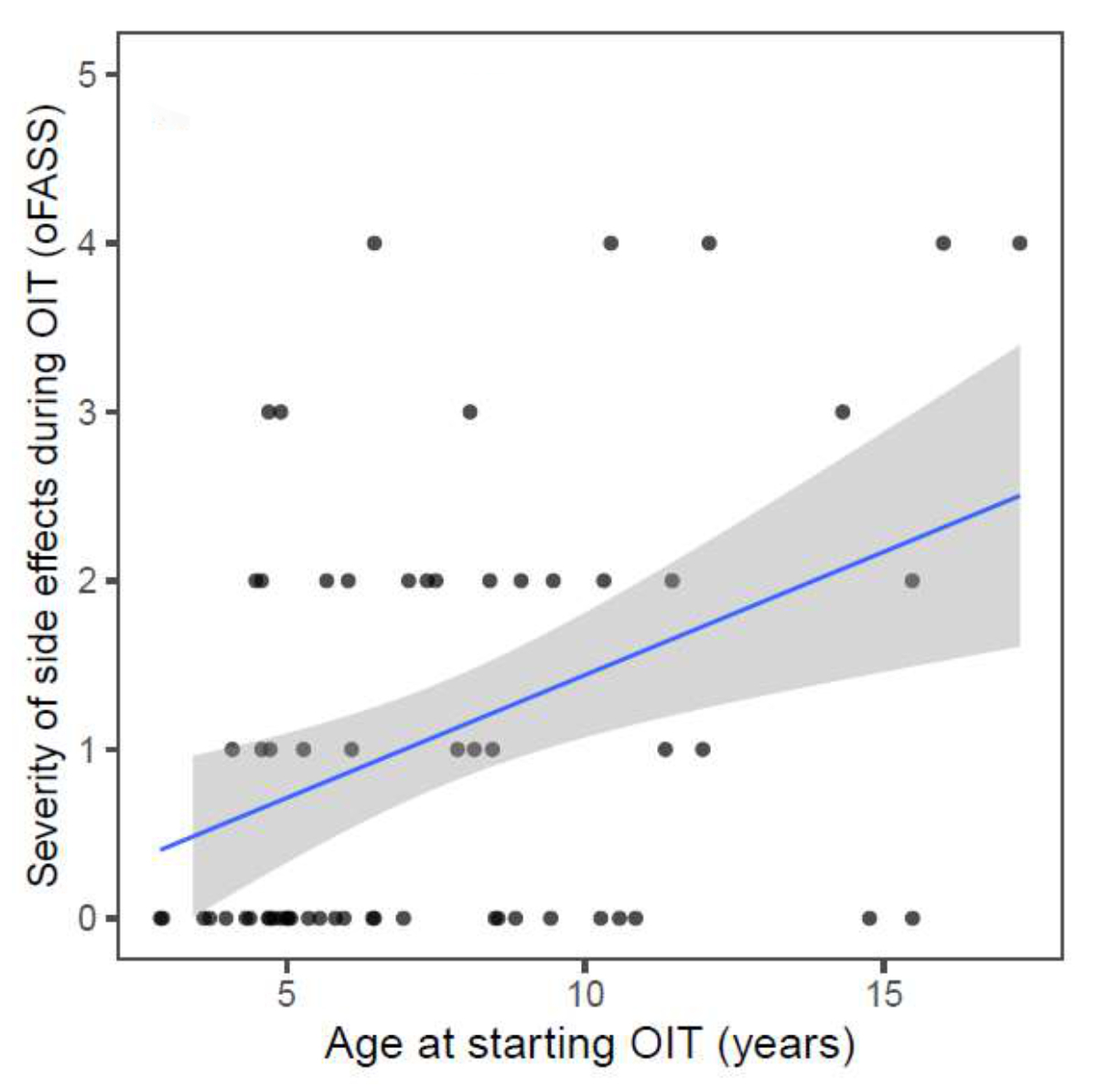 Figure S3Maximum severity of side effects during oral immunotherapy (OIT) in relation to age at start of the oral immunotherapy. R = 0,4; p = 0.001. oFASS-5:ordinal food allergy severity scale 5.