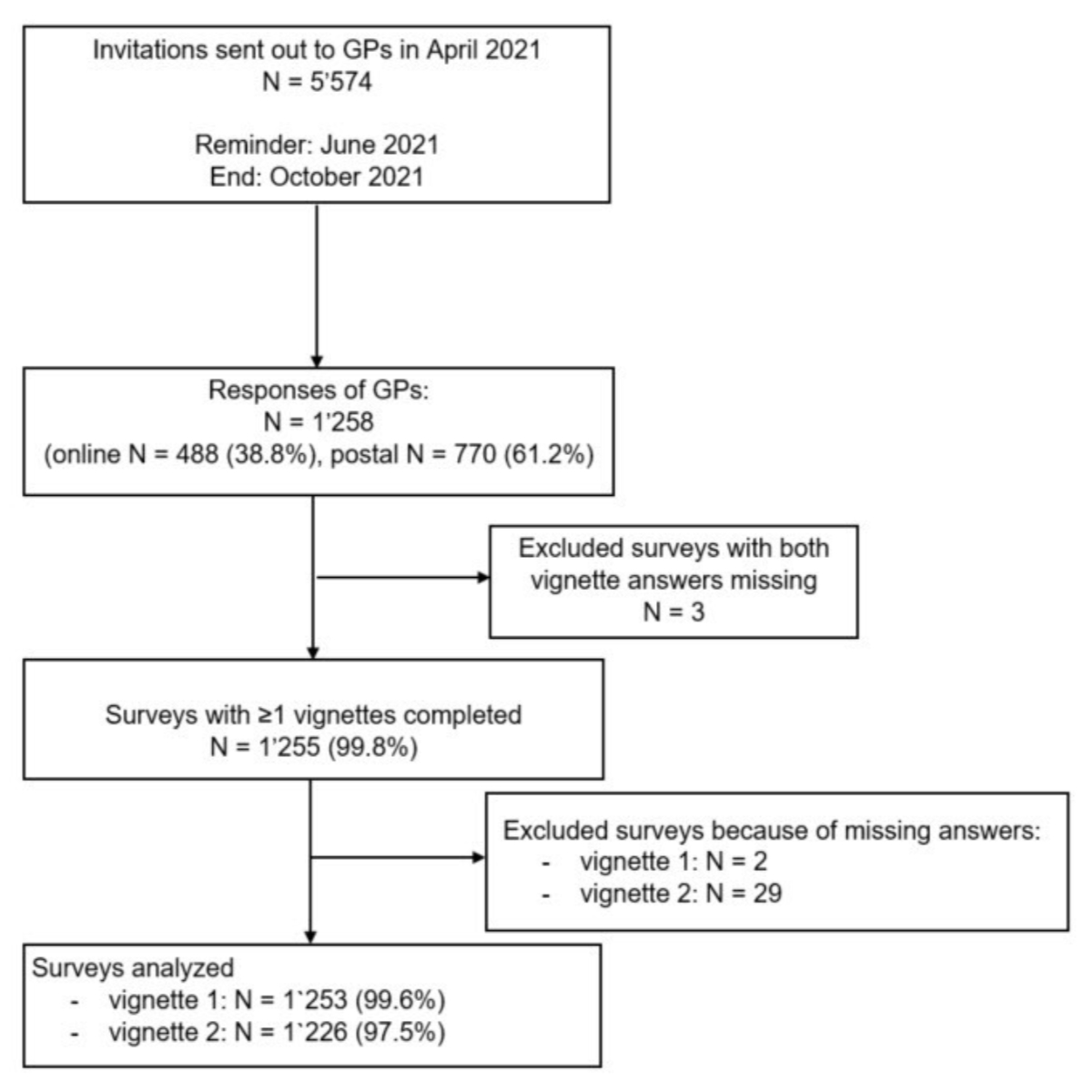 Of the 1258 surveys received, 934, 278 and 46 were from GPs working in German-, French- and Italian-speaking regions, respectively. Figure 2 depicts the GP distribution across Swiss cantons. After the exclusion of three surveys with no answers to any of the vignettes, we analysed 1253 surveys for vignette 1 and 1226 for vignette 2 (29 surveys had no answers to vignette 2; see also study flow in figure 1).