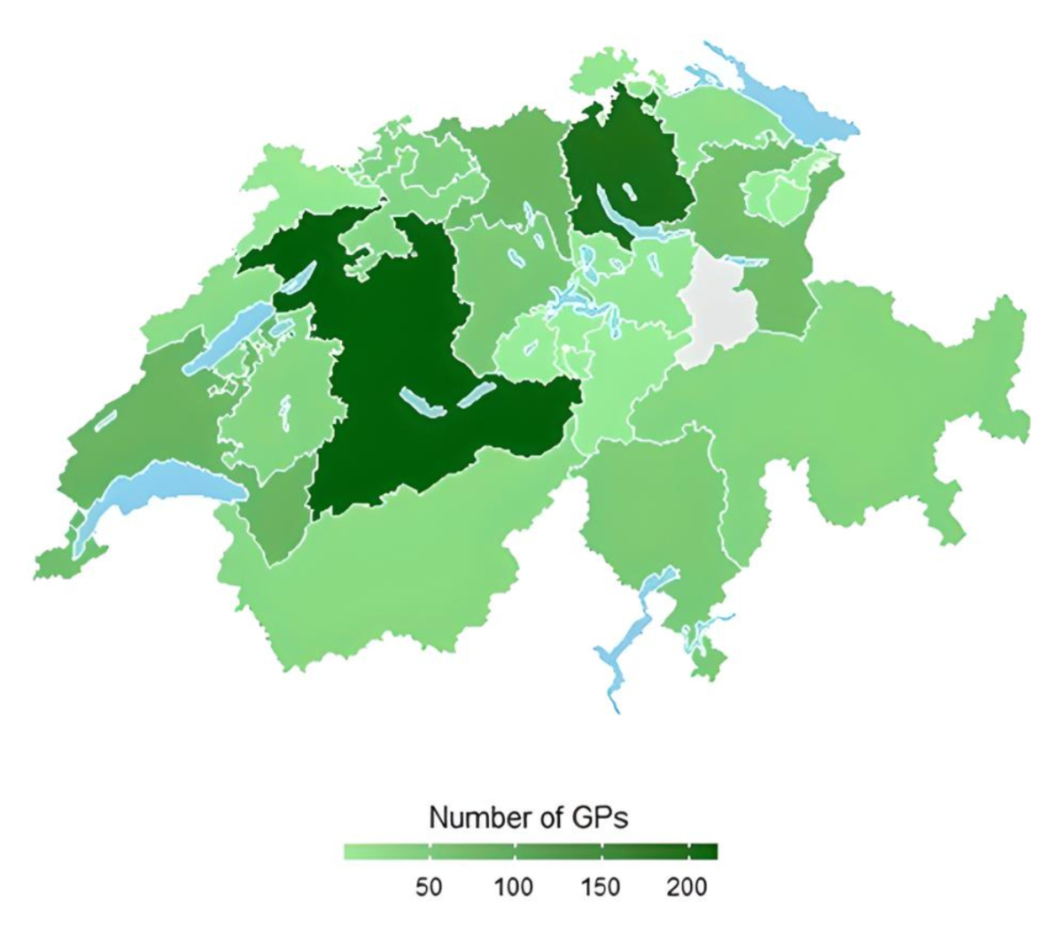 Figure 2Distribution of participating general practitioners (GPs) across Swiss cantons.