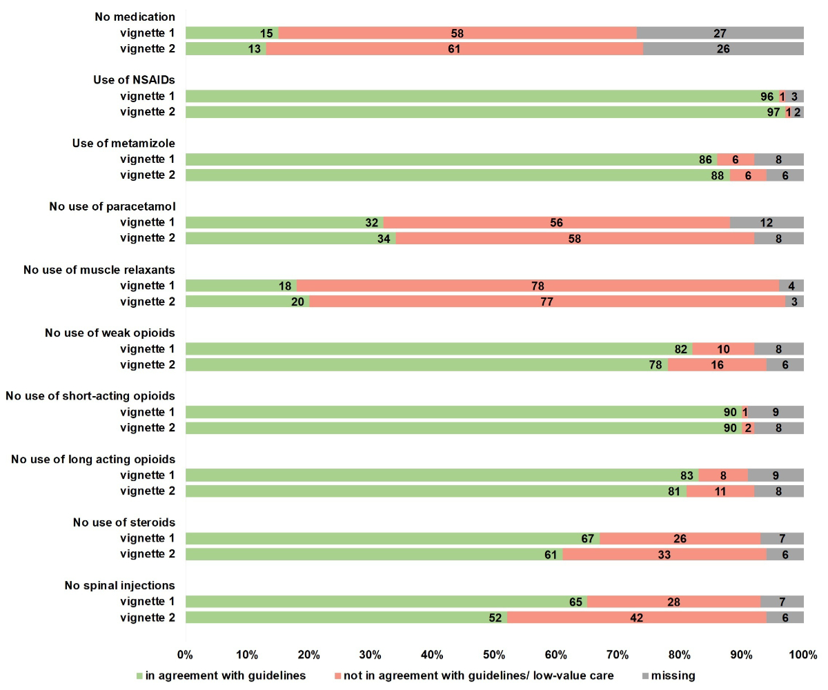 There are several limitations that need to be discussed. First, we cannot exclude a selection of GPs that responded to the survey (response bias). If we hypothesise that GPs more interested in the treatment of acute low back pain responded to the survey, we would expect an even higher proportion of non-adherence with guideline recommendations in non-respondents. Second, although clinical vignettes to assess choices in medical practice are well established [76] and although we used accepted methods for them [28], they do not objectively assess real-time clinical care, and thus management may be different than reported in our study. However, 95% of GPs rated the clinical vignettes to be representative of their real low back pain patients. Third, we used cut-offs for agreement with guidelines/low-value care that may not be in agreement with all guidelines. For example, the use of paracetamol has changed over time and no evidence-based recommendations for metamizole exist. Different and changing guideline recommendations may influence current clinical practice and the delay between the publication of new evidence and its adoption into clinical practice may explain some of the variation observed in the current study. Finally, we cannot exclude chance findings due to multiple testing.