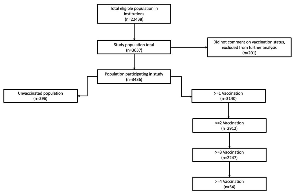The entire eligible population (i.e., all employees at participating institutions) comprised 22,438 people (figure 1). The study population consisted of 3,637 individuals, of whom 201 (5.5%) did not indicate their vaccination status and were therefore excluded. Of the remaining 3,436 participants (i.e., 15% of the eligible population), 2,794 (81.3%) identified as female, and 642 (18.7%) identified as male; the mean age was 43.7 years (range 16–73 years). Most healthcare workers worked in an adult or paediatric acute care institutions (n = 2998, 87.3%), followed by psychiatric (n = 292, 8.5%) and geriatric/rehabilitation (n = 146, 4.2%) clinics.