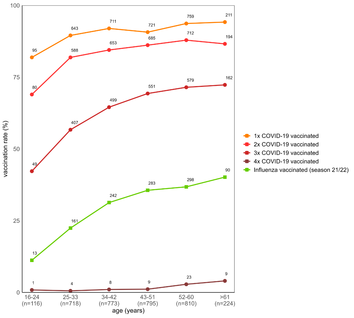 Figure 2Number of SARS-CoV-2 vaccine doses and receipt of seasonal influenza (2021/2022) vaccination among healthcare workers across age groups.