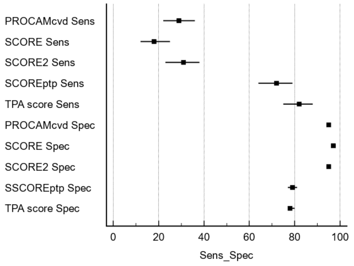 Thus, it may be argued that additional tests like TPA may not be necessary with SCORE2. In order to test this hypothesis, we analysed our cohort study data. First, we performed sensitivity and specificity analyses and found that SCORE and SCORE2, when compared to PROCAM for detecting ASCVD at the intermediate-risk threshold, was significantly higher for sensitivity, but significantly lower for specificity and at the high-risk threshold results were comparable for PROCAM, SCORE and SCORE2 regarding specificity. Therefore, the higher sensitivity for SCORE2 when compared to PROCAM could be reproduced; however, SCORE and SCORE2 sensitivity performance was very similar, and this again is most likely due to the low threshold for intermediate risk in SCORE, which was chosen to be 1.0% for cardiovascular mortality, instead of e.g. 2.5%. Therefore, lower risk thresholds increase sensitivity while sacrificing specificity, as expected and reproduced by our data.