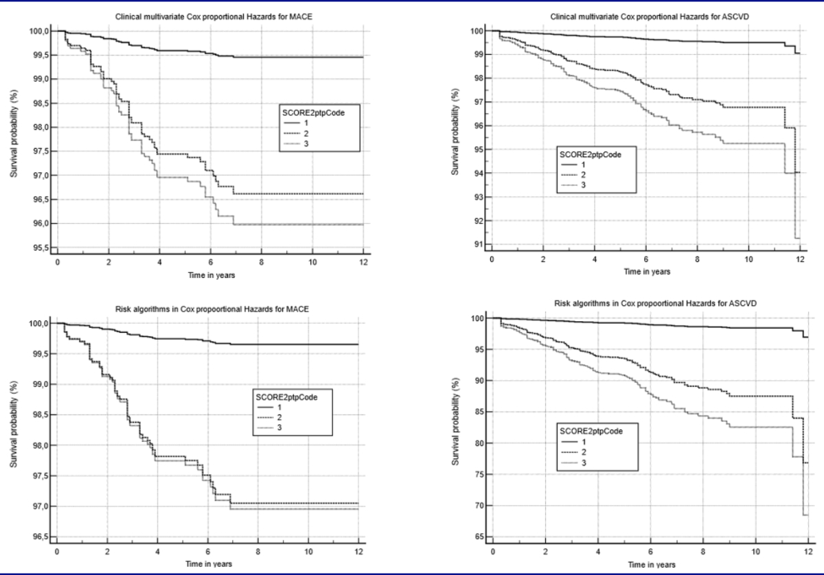 Reliability of discrimination is improved with TPA and associated post-test risk in our study. Reliability of calibration is also significantly improved using model fit (logistic regression model, table 3, figure 2). When TPA was used to define SCORE2ptp, we observed a significantly better result in the Cox proportional-hazards model for MACE and ASCVD when compared to PROCAM and SCORE (table 5, figure 3).
