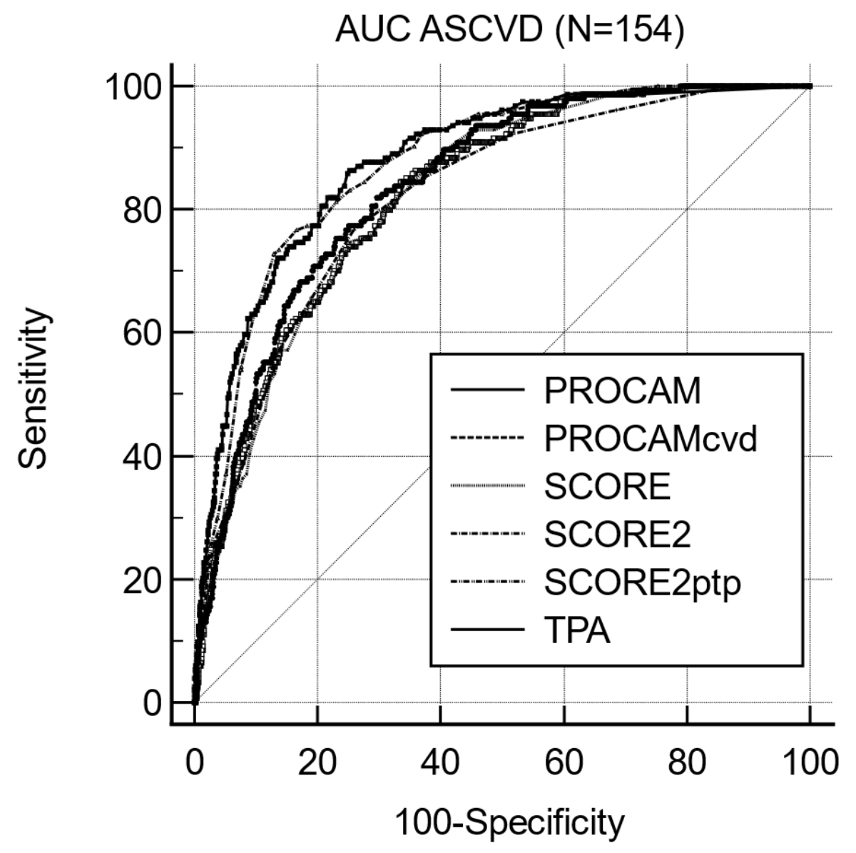P for ASCVD: PROCAM vs PROCAMcvd: p = 0.0002; PROCAM vs SCORE2PTP: p = 0.0001; PROCAM vs TPA: p = 0.0006; PROCAMcvd vs SCORE2PTP: p = 0.0008; PROCAMcvd vs TPA: p = 0.0049; SCORE vs SCORE2PTP: p <0.0001; SCORE vs TPA: p = 0.0004; SCORE2 vs SCORE2ptp: p <0.0001; SCORE2 vs TPA: p = 0.0001; all others p = non-significant.