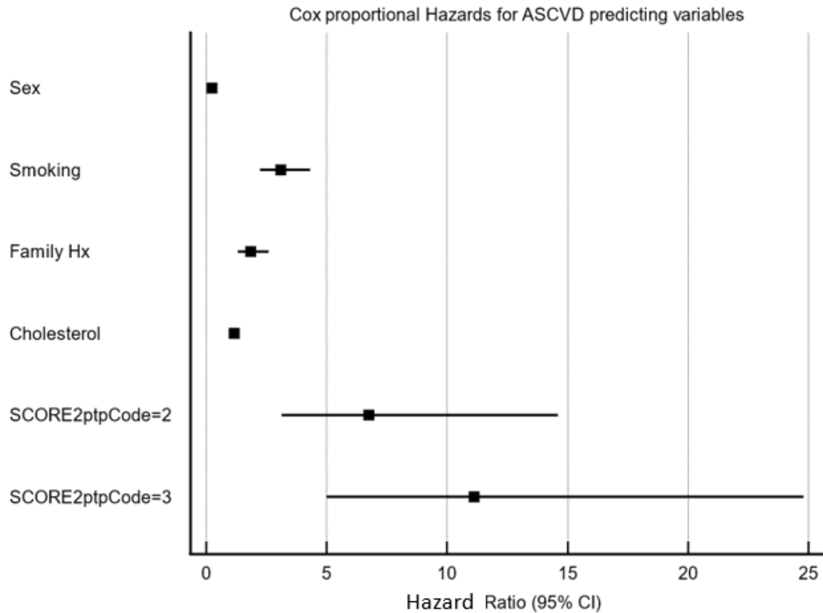 Figure S2Forest plot of ASCVD hazard ratios and 95% CIs predicted by clinical variables and post-test risk categories based on TPA and SCORE2 (source: table 5).