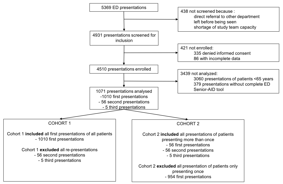 Some patients re-presented during the study period. Due to re-presentations, we formed two separate cohorts. Cohort 1 included only index presentations of all unique patients aged ≥65 years for whom the Emergency Department Senior Abuse Identification tool was completed.