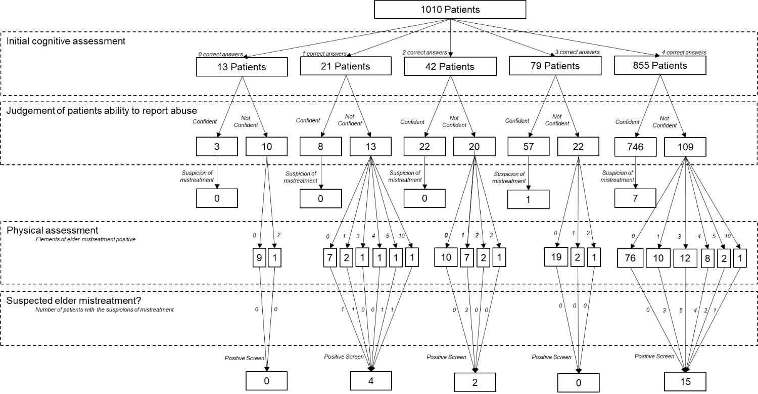 In the third step, the attending physician was interviewed about the patient’s ability to report mistreatment. Attending physicians were confident in 836 (82.8%) of all patients and not confident in 174 (17.2%) in Cohort 1, leading to a subsequent physical assessment to identify mistreatment.