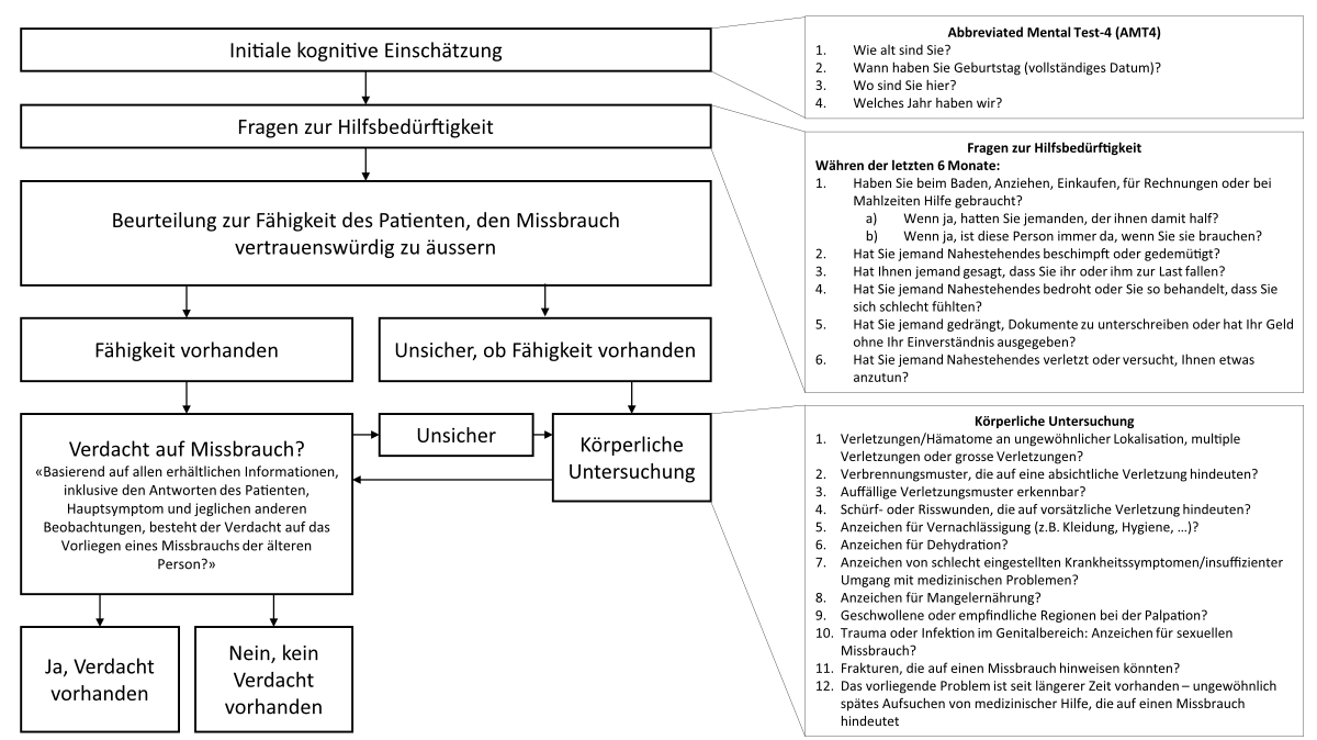The Emergency Department Senior Mistreatment Identification (ED Senior AID) tool was translated into German following the ISPOR guidelines [7, 27]. Two independent forward translations into German were made. These were then aligned by having the translators compare their versions. The resulting common version was independently translated back into English by two native English speakers. These back-translations were then compared to the original. All translations were harmonised to ensure conceptual equality between the original and the translation. No cross-cultural adaptations were needed. The resulting German translation of the Emergency Department Senior Abuse Identification tool was then used and can be found in the appendix of this article (Figure S1). The study team performed the first two steps, and the attending physician in charge performed the subsequent steps.