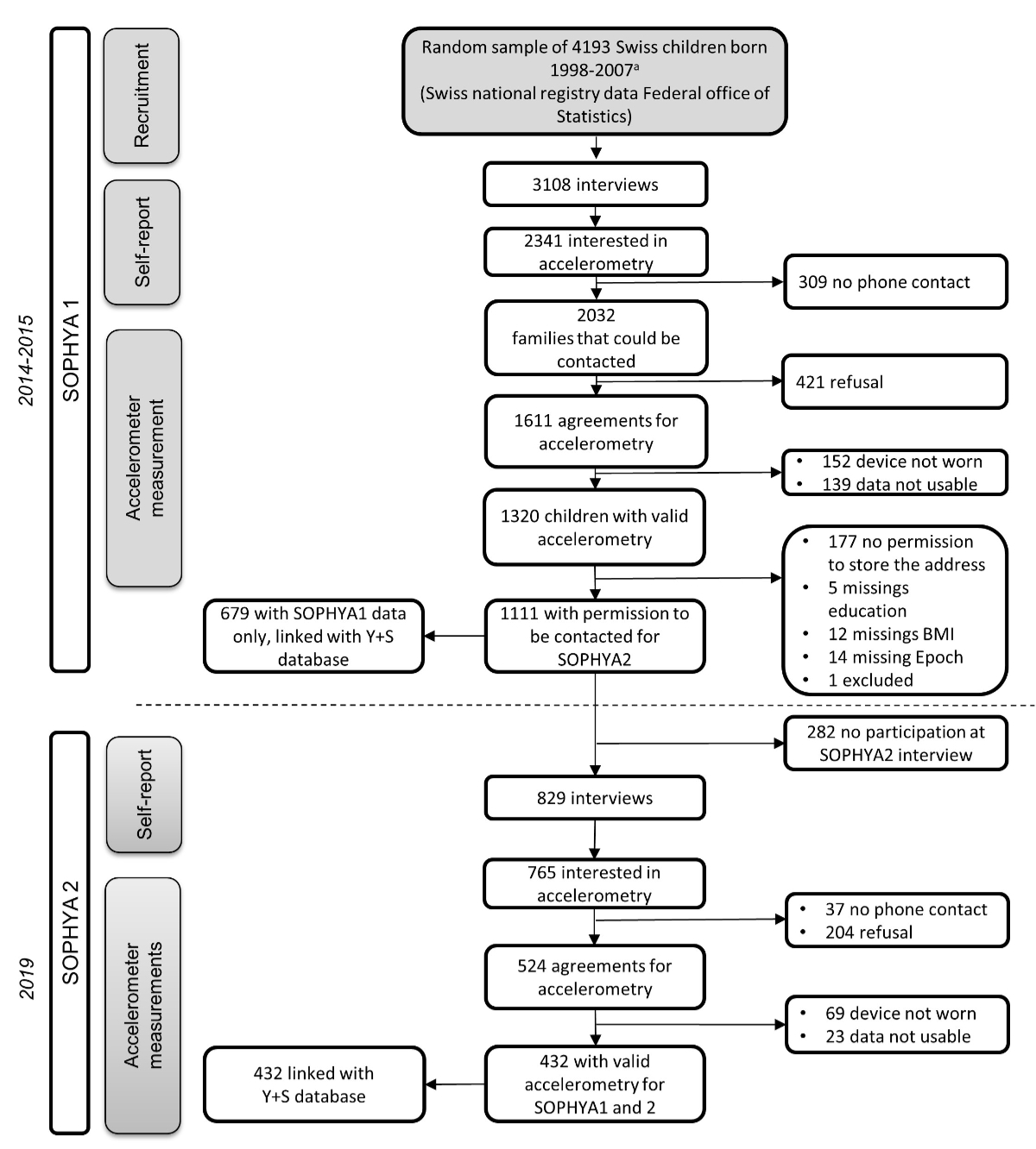 Figure 1Participant flowcharts for SOPHYA1 and SOPHYA2. Children were recruited for the SOPHYA study through two distinct sources. Children born in 1998 to 2002 were recruited through the established Sport Switzerland study [39]. Children born between 2003 and 2007 were recruited by the SOPHYA study through a similar but notably shorter interview process.