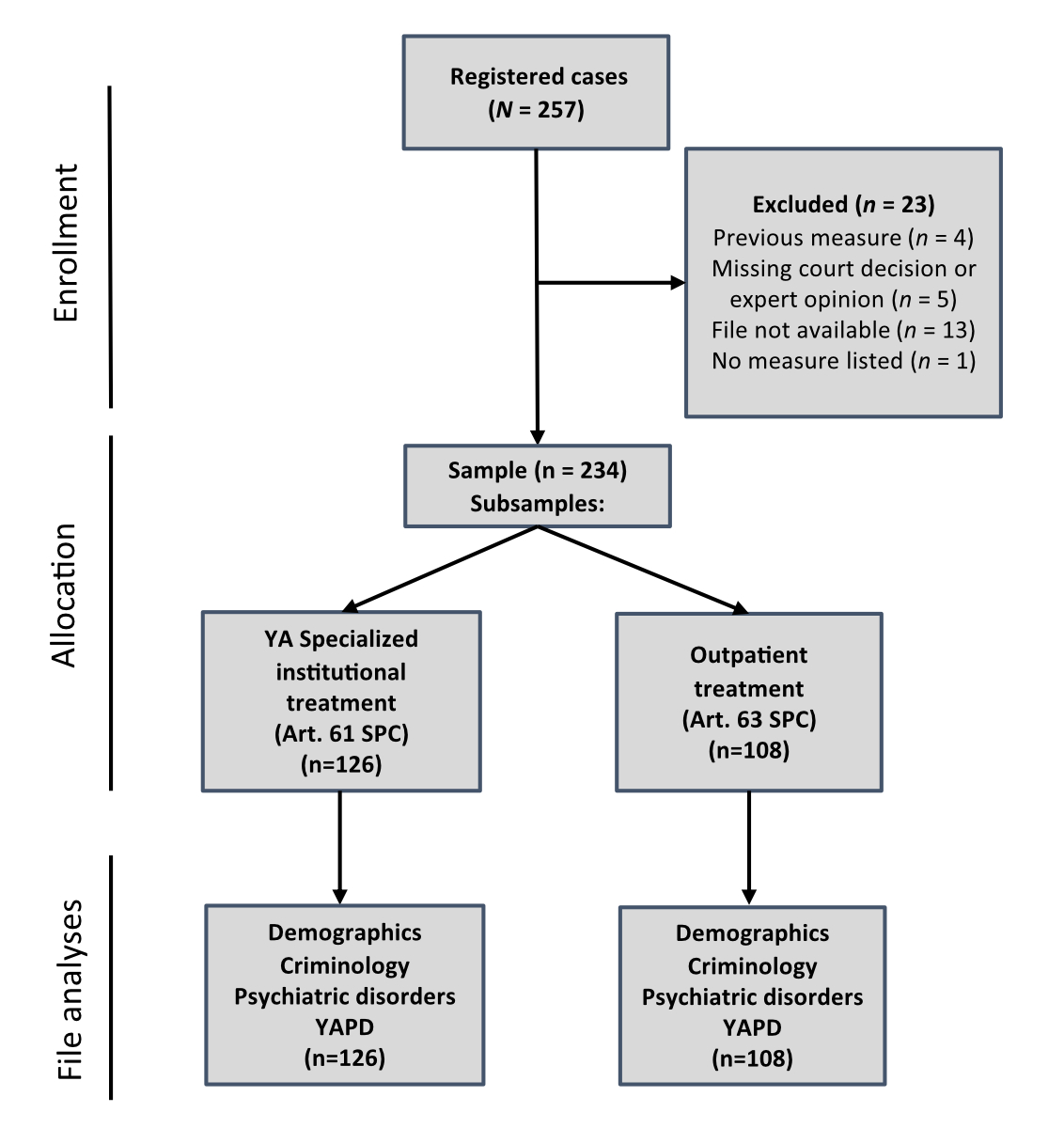 Figure 1Flowchart. SPC: Swiss Penal Code; YA: young adult; YAPD: young adult personality development.