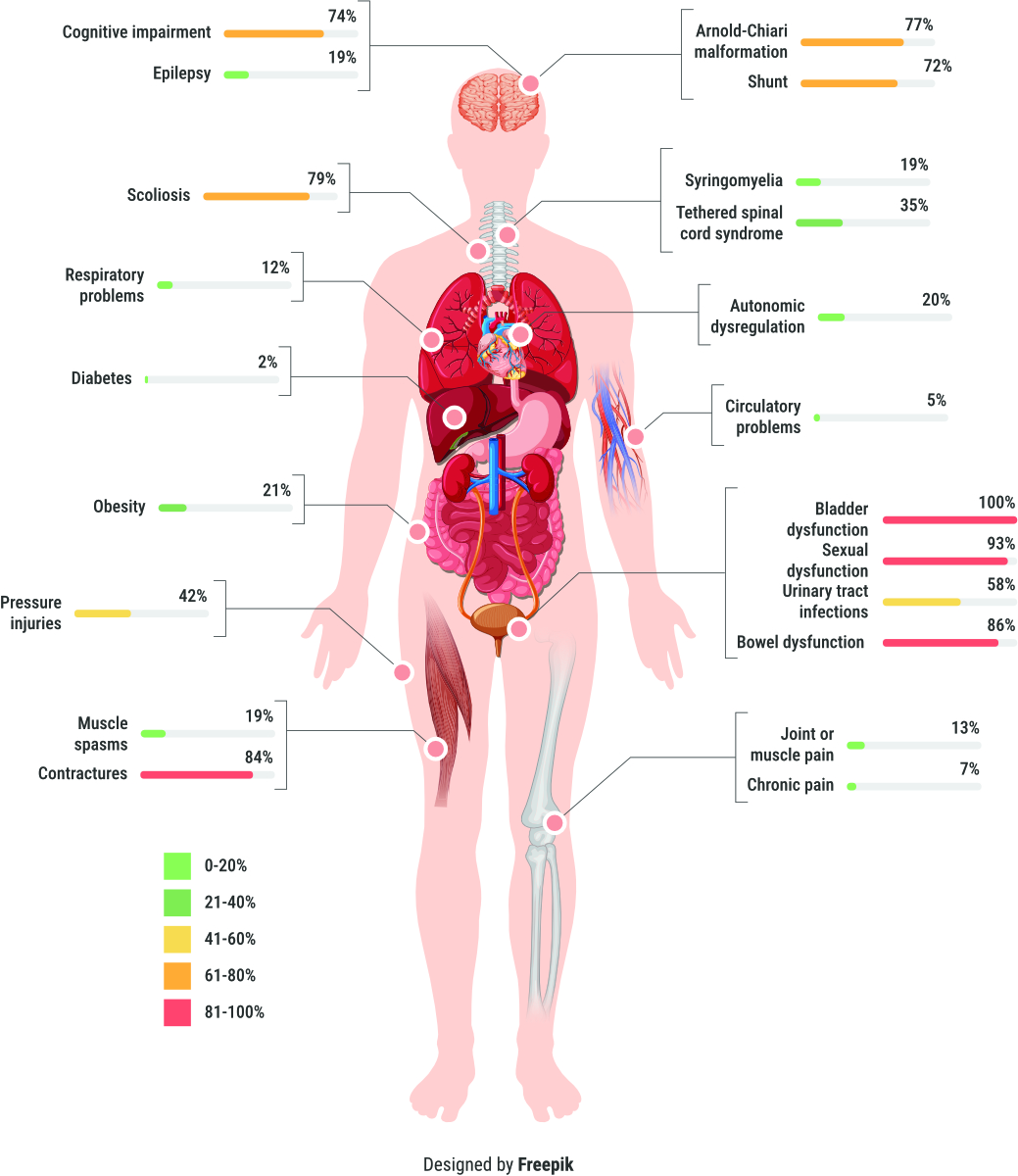 Among the potentially modifiable secondary health conditions, urinary tract infections were reported in 58% of the individuals, pressure injuries in 42%, and obesity and respiratory problems in 21% and 12%, respectively.