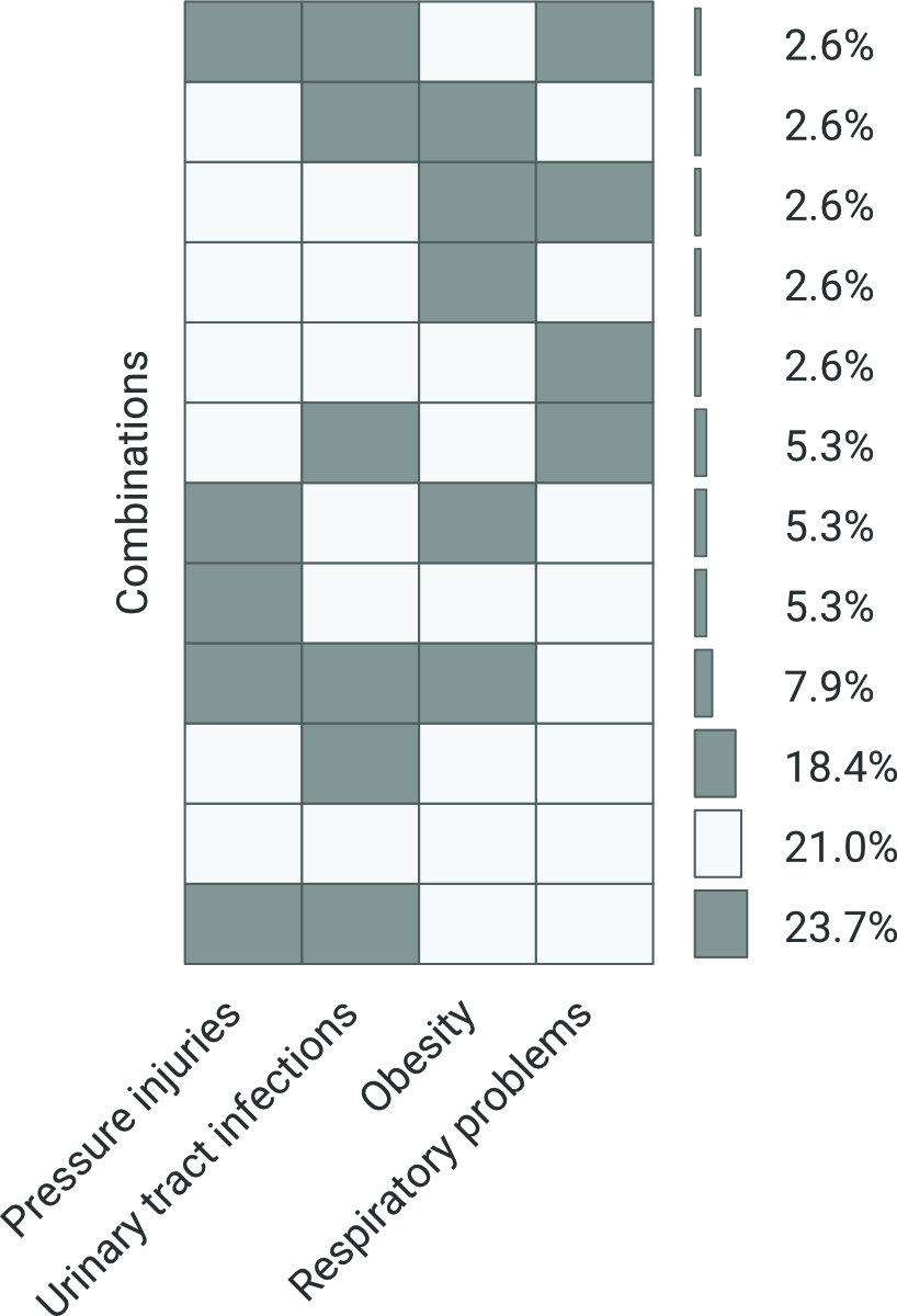 Co-occurrence analysis for modifiable secondary health conditions. This figure shows the co-occurrence of four secondary health conditions in analyses based on individuals who had complete information (n = 38). The dark grey colour indicates presence of secondary health conditions, the light grey colour indicates no SHC. For instance, 23.7% of individuals had pressure injuries and urinary tract infections co-occurring together, whereas 21% of individuals had none of these four secondary health conditions co-occurring together.