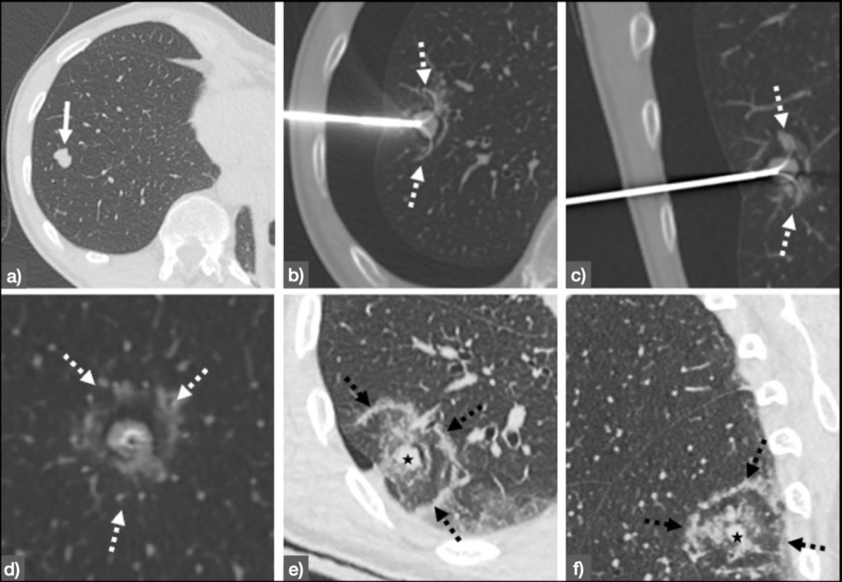 Figure 3Radiofrequency ablation of histologically proven early-stage (Stage IA) non-small cell lung cancer [46] in a 65-year-old patient. Panel A shows the planning CT depicting the tumour (white arrow) before intervention. Panels B (axial), C (sagittal) and D (coronal) show the deployable radiofrequency ablation (RFA) needle (LeVeen 3.5 cm, Boston Scientific, Natick, MA, USA) in place covering the entire lesion (white dotted arrows). Panels E (axial) and F (coronal) show the control scan immediately after the procedure, in which the ablation margin (black dotted arrows) is clearly visible with sufficient distance to the treated tumour (black star). After one year, no signs of local recurrence were detected.