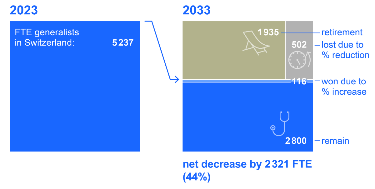 Switzerland’s workforce of generalists will dramatically decrease by 44% within 10 years. The main driver is retirement, followed by planned workload reductions. The need to fill this gap depends on various factors, including attracting more generalists, workload, dropouts, influx from abroad, retirement and population growth. Based on this study, policymakers, universities, healthcare institutions and professionals themselves should invest in attractive job options and career plans for generalists to fill the gap.