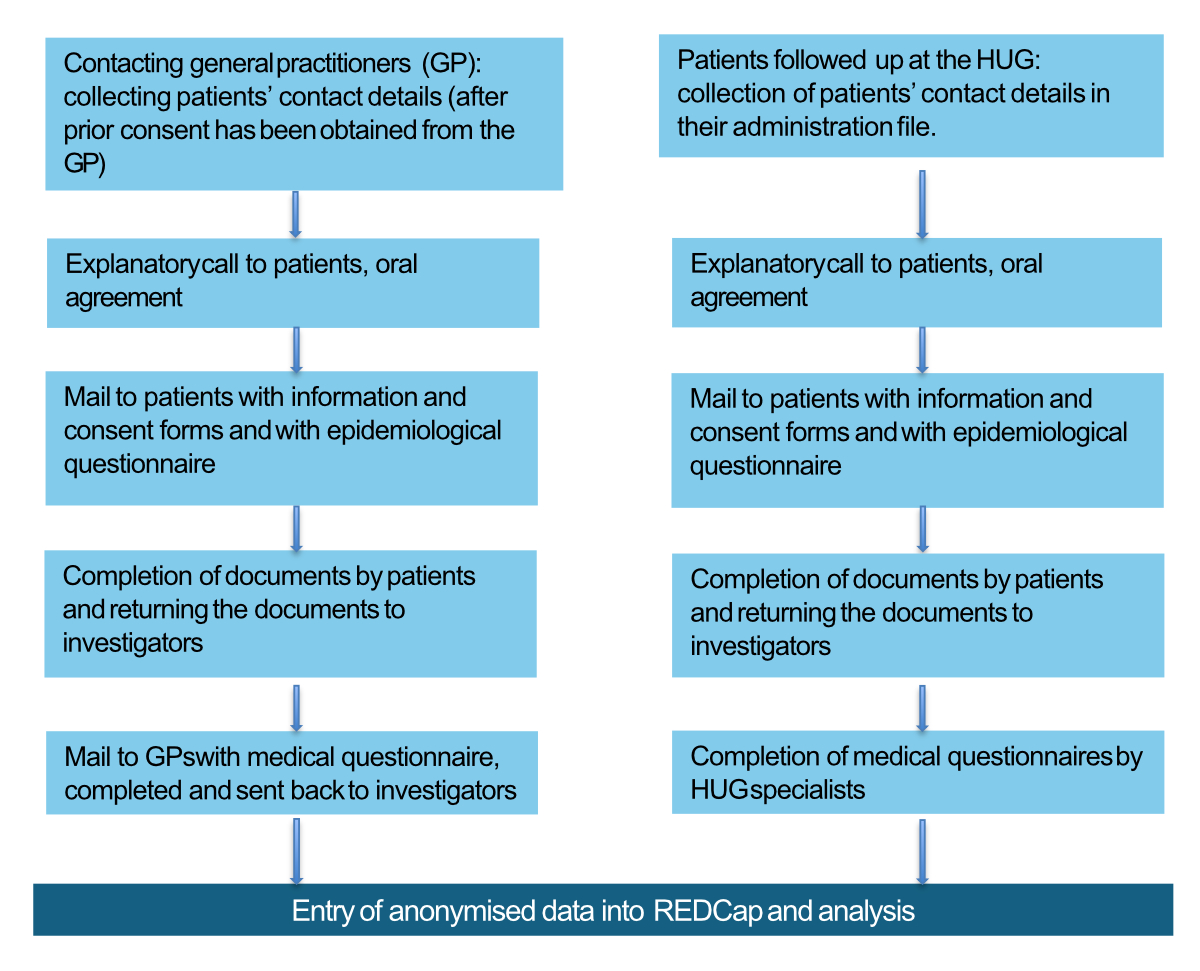 Patients were recruited from two sources (figure 2). The first source consisted of patients followed at the University Hospitals of Geneva (HUG). We directly asked patients for their oral consent and then sent them the consent form along with an explanatory letter and an epidemiological questionnaire. The second source included patients followed outside the HUG. To do this, we contacted and sent a medical questionnaire to the physicians most likely to encounter this parasitic disease – hepatogastroenterologists, infectious disease specialists and abdominal surgeons – through the Geneva telephone directory, hepatogastroenterology forums and the association of private hepatogastroenterologists.