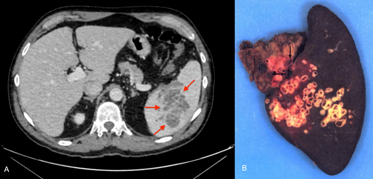 The analysis of the surgical specimen confirmed the diagnosis of alveolar echinococcosis in 12 of the 13 patients for whom we had access to the histopathological report. For 1 patient, who died, we were unable to retrieve the report. One patient underwent surgery with an initial diagnosis of very probable cholangiocarcinoma. Histopathological examination of the surgical specimen, followed by specific serology, led to the diagnosis of alveolar echinococcosis. The patient with primary splenic alveolar echinococcosis underwent curative splenectomy (figure 5).