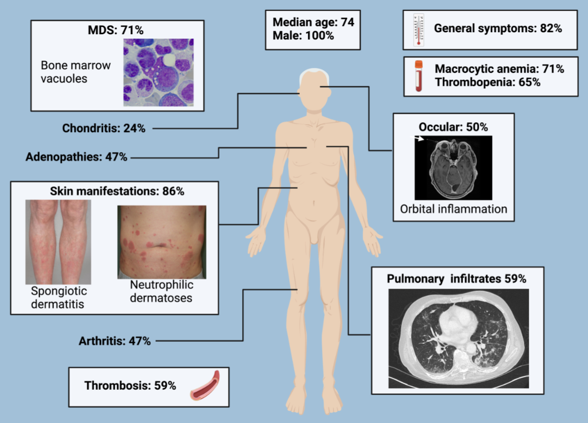 Identified in 2020, VEXAS syndrome (Vacuoles, E1 Enzyme, X-linked, Auto-inflammatory, Somatic) is a unique monogenic auto-inflammatory disease that emerges predominantly in the later stages of life. It is caused by a somatic mutation in the ubiquitin-like modifier activating enzyme 1 (UBA1) gene, predominantly impacting myeloid precursor cells. Current scientific understanding suggests that UBA1 mutation reduces ubiquitylation, leading to heightened oxidative stress and the accumulation of unfolded proteins, resulting in inflammation [1, 2]. The clinical features of VEXAS syndrome include general symptoms (fever, weight loss and sweats), musculoskeletal complaints, pulmonary infiltrates, skin manifestations (e.g. neutrophilic dermatosis), eye involvement and thromboembolism [3]. Interestingly, VEXAS syndrome has specific features that distinguish it from other immune-mediated inflammatory diseases: it is highly associated with myelodysplastic syndromes and is more resistant to immunosuppressive drugs [3].