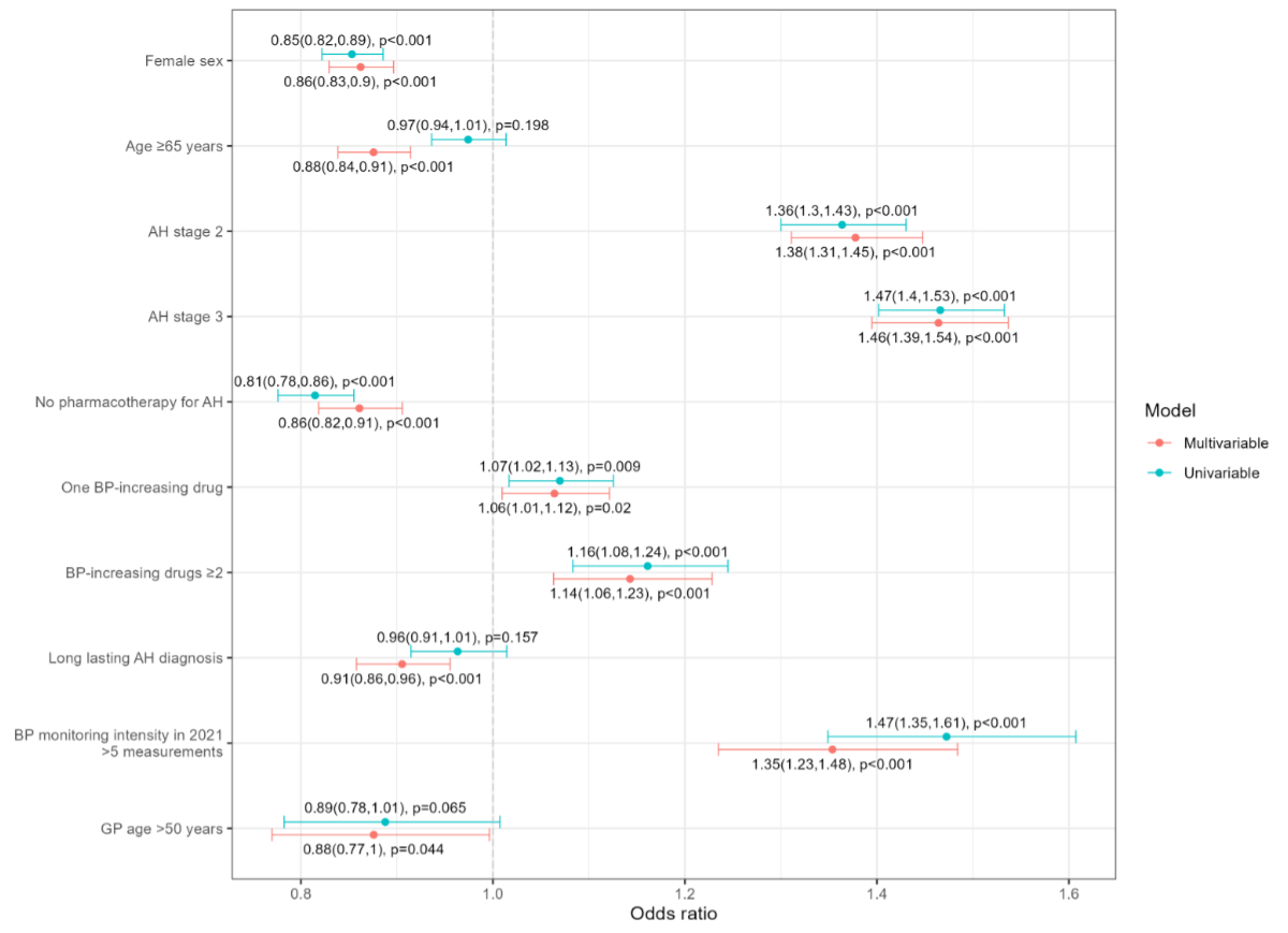 Figure 3Unadjusted (univariable) and multivariable (adjusted) logistic mixed regression model (forest plot) of blood pressure control. General practitioners (GPs) were considered as random effects. AH: arterial hypertension; BP: blood pressure; OR: odds ratio; CI: confidence interval.