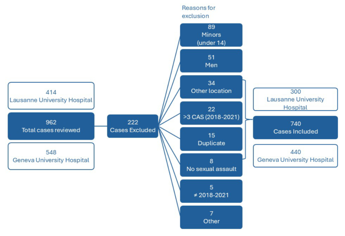 A total of 962 sexual assault records during the 48-month study period were reviewed (414 from Lausanne University Hospital and 548 from Geneva University Hospitals), of which 740 cases were retained for analysis.