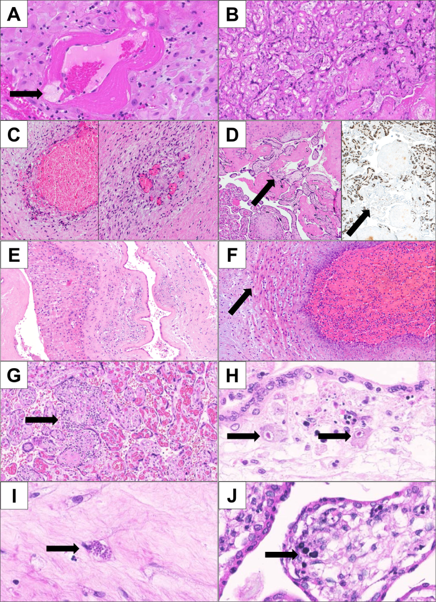I: Toxoplasma gondii (the arrow points to a toxoplasma cyst in the chorionic plate) (HE, 400×).