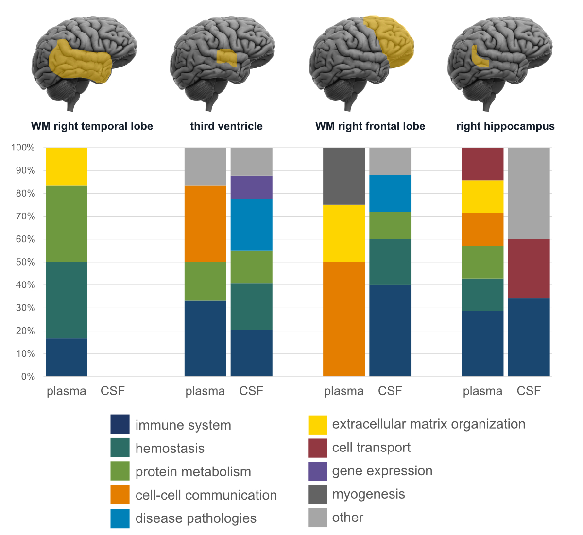 Figure 1Distribution of enriched biological pathways (based on the Reactome database) of plasma and cerebrospinal fluid (CSF) proteins (expressed as percentages) in four brain regions are shown. The higher the percentage of enriched pathways of neuropsychiatric symptoms (NPS), the stronger its association with atrophy in the respective brain region. Regions and proteins were selected based on their associations with NPS. WM: white matter.