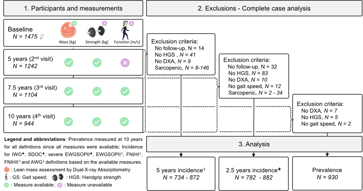 5yrs: 5 to 10 years visits; 2.5yrs: 7.5 to 10 years visits; HGS: handgrip strength; ALM: appendicular lean mass; ALMI: ALM/height2; BMI: Body Mass Index; SDOC: Sarcopenia Definitions and Outcomes Consortium; EWGSOP: European Working Group on Sarcopenia in Older People II (2019); FNIH: Foundation for the National Institutes of Health Sarcopenia Project I (2014) and II (2017); IWG: International Working Group on Sarcopenia