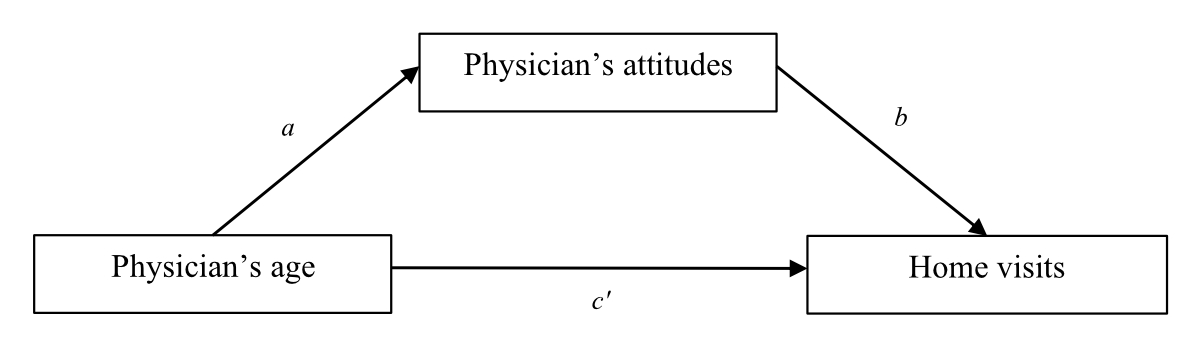Figure 1Model of the hypothetical association pathways between physician’s age (the predictor), physician’s (negative or positive) attitudes towards home visits (the mediator) and home visits (the outcome).