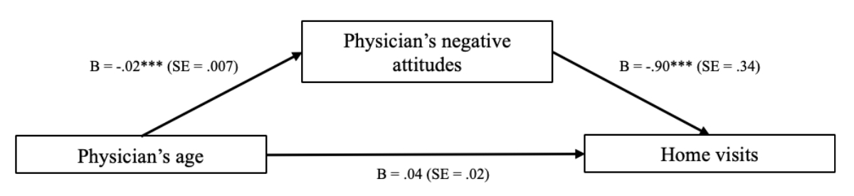 Figure 3Effects of physician’s age on home visits via the mediation of the negative attitudes. B = beta value; SE = standard error. *** p <0.001.