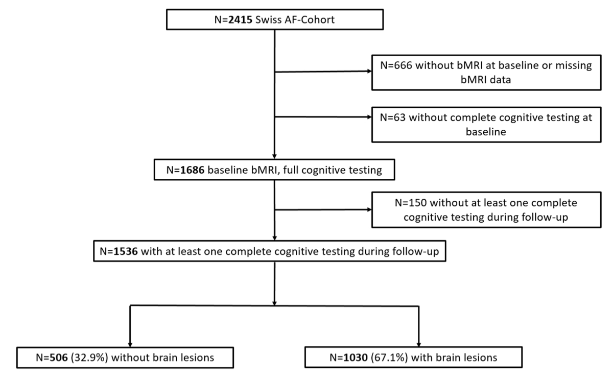 Atrial fibrillation (AF) is strongly associated with cognitive decline and dementia [5–8]. We have previously shown in the Swiss Atrial Fibrillation Cohort Study (Swiss-AF) [9] that atrial fibrillation patients have a high burden of various brain lesions on brain magnetic resonance imaging (MRI). These brain lesions include microbleeds, white matter lesions and ischaemic strokes, both clinically overt and covert (brain infarcts without any symptomatic presentation) [10]. All of these lesions are known to potentially contribute to a decline in cognition over time [11, 12]. However, the association between atrial fibrillation, structural brain damage and the development of cognitive decline over time is still poorly understood. A better understanding of these associations may improve our understanding of the functional relevance of brain damage in atrial fibrillation patients and could thus be helpful for the future management of these patients.