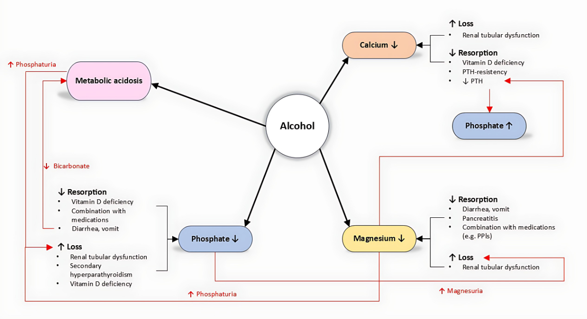 In addition, excessive alcohol intake can cause disturbances in phosphorus, magnesium, and calcium levels. The physiological interactions of these electrolytes and their homeostasis are closely linked (figure 1). An alteration in one can amplify the others, promoting a fatal vicious cycle. This review focuses on the direct and indirect effects of alcohol – as well as alcohol withdrawal – on phosphate, magnesium, and calcium.